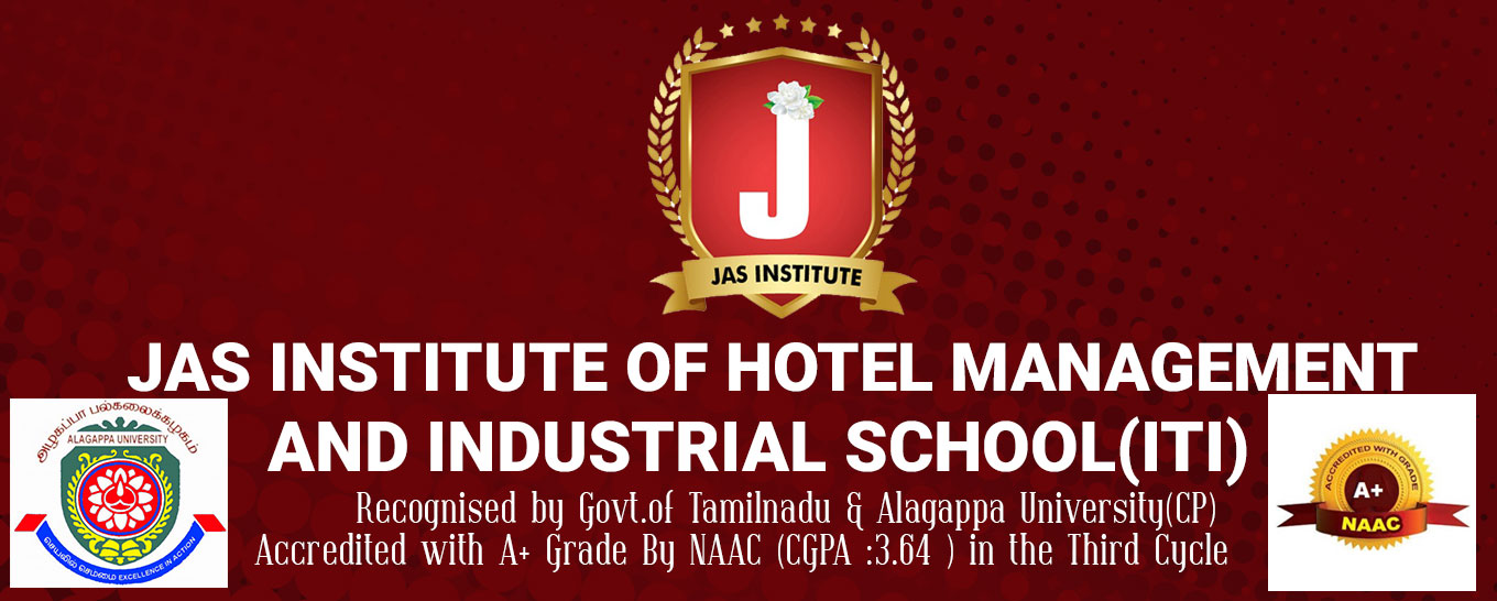 Jas Institute of Hotel Manaagement and Industrial School is run by Fathima Educational and Charitable Trust (Reg. No.: 21/11) founded by A. Mohamed Shalauddin and A. Nasiyathu Nisha. The motto of our institution is "We will create a brave new world". Our institute located in heart of the place in Ramanathapuram. Having a full range of strength in Catering and Professional courses with a good landmark in ramanathapuram . Jas Institute is affiliated by alagappa university(CP). Jas College is approved by both State and Central Governments. We are ISO 9001:2008 certified institution.